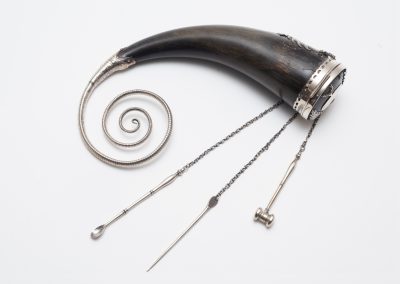 It was crafted from a silver mace that originally belonged to a Drum Major in the British Army. (A mace was a baton used for conducting a band or for ceremonial purposes.) The piece was repurposed by Private Jock Fraser of the 72nd Regiment while he was held captive during the Xhosa Wars in South Africa in the early 1800s.